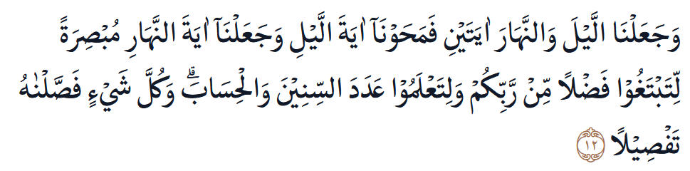 Kami jadikan malam dan siang sebagai dua tanda (kebesaran Kami). Kami hapuskan tanda malam dan Kami jadikan tanda siang itu terang benderang agar kamu (dapat) mencari karunia dari Tuhanmu dan mengetahui bilangan tahun-tahun dan hisab/perhitungan (waktu). Segala sesuatu telah Kami terangkan secara terperinci.