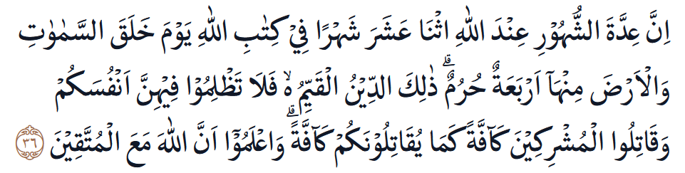 Sesungguhnya bilangan bulan-bulan di sisi Allah ialah dua belas bulan, (sebagaimana) ketetapan Allah pada waktu Dia menciptakan langit dan bumi, di antaranya ada empat bulan haram. Itulah (ketetapan) agama yang lurus, maka janganlah kamu menzalimi dirimu padanya (empat bulan itu), dan perangilah orang-orang musyrik semuanya sebagaimana mereka pun memerangi kamu semuanya. Ketahuilah bahwa sesungguhnya Allah bersama orang-orang yang bertakwa.
