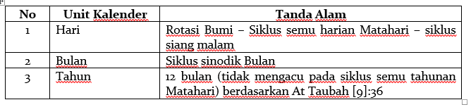 Selama ini kalender Hijriah dipahami sebagai kalender murni menggunakan siklus Bulan. Padahal untuk tanda waktu harian tetap menggunakan Matahari, yaitu rotasi bumi yang mengakibatkan siklus semu harian Matahari atau siklus siang malam. Dapat diperhatikan waktu sholat menggunakan posisi Matahari. Begitu juga waktu untuk puasa Ramadhan, acuan bulanan menggunakan siklus bulan, sedangkan waktu harian menggunakan siklus semu harian Matahari ditunjukkan di Al Baqarah [2]:187.