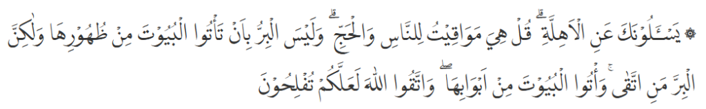 Mereka bertanya kepadamu tentang ahillah Katakanlah, “Itu adalah mawaqit bagi manusia dan haji.” Bukanlah suatu kebajikan memasuki rumah dari belakangnya, tetapi kebajikan itu adalah (kebajikan) orang yang bertakwa. Masukilah rumah-rumah dari pintu-pintunya, dan bertakwalah kepada Allah agar kamu beruntung.