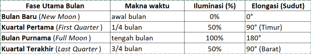 Wajah-wajah bulan ini dapat diamati setiap harinya, selain wajah bulan saat dekat dengan ijtimak. Makna waktu diturunakn secara rasional dari bentuknya, terutama makna waktu dari 4 fase utamanya.